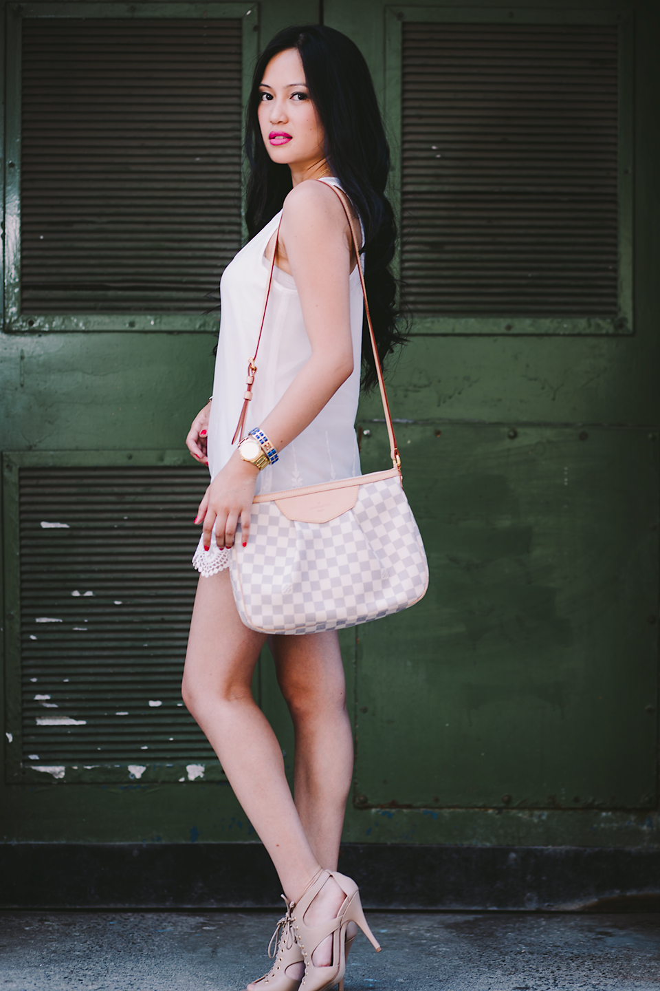 I chose this cotton white top with a delicate embroidered lace detail of flowers at the end seam, top from David Bitton. I finished off the look with a pair of laced up shoes from Aldo Shoes. I've been obsessing over cross bodies bags for a while now so I chose this Siracusa PM from Louis Vuitton (purchased in LV Flagship in Paris last year) which puts together the whole look.